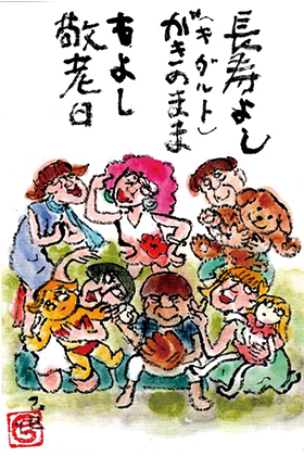 個展 戯画個展 銀座で5回、引退後1日1句1画の句画を描き、毎年末東京で個展開催。 |